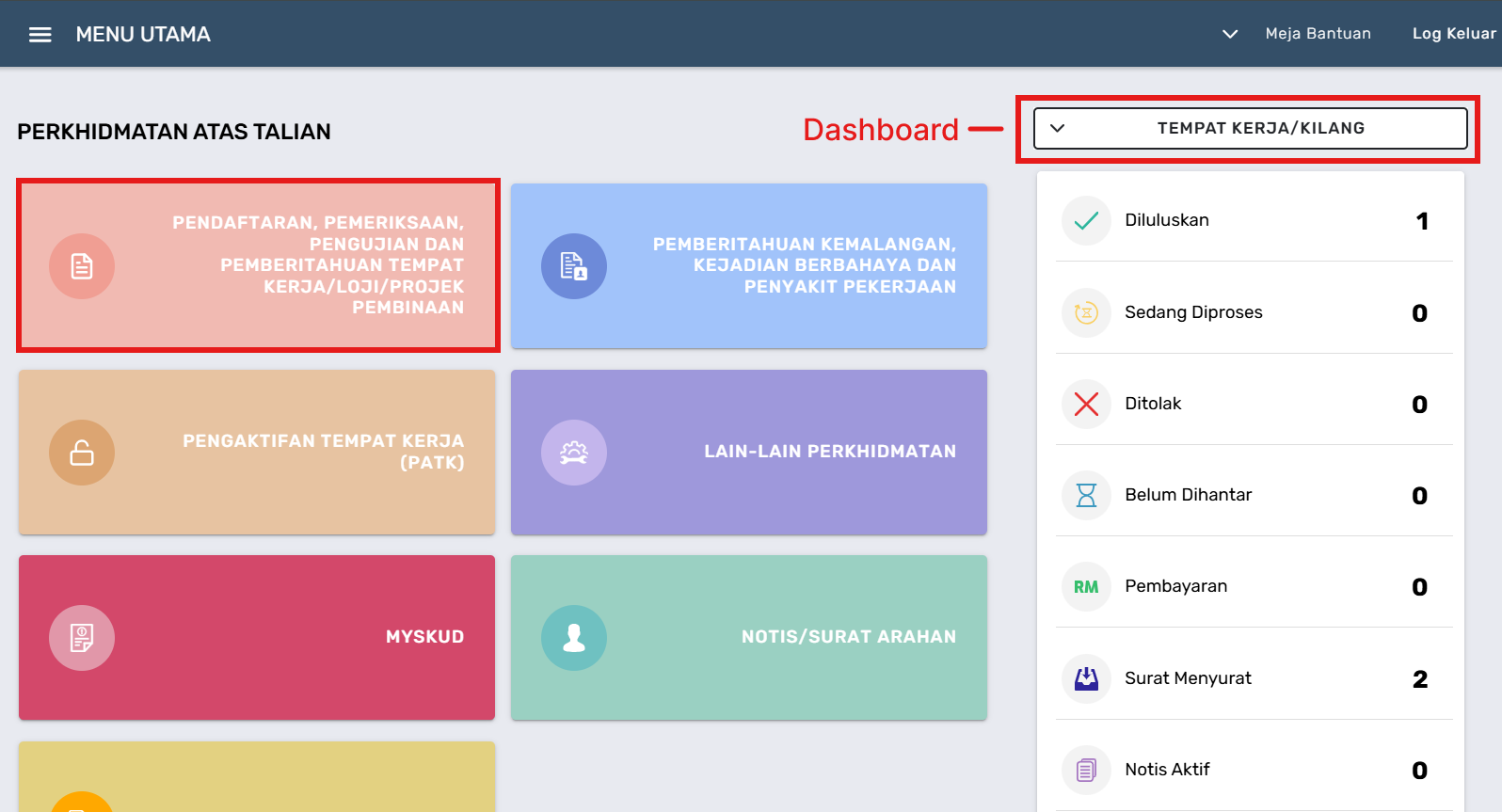 - Klik pada butang Pendaftaran, Pemeriksaan, Pengujian Tempat Kerja/Loji/Projek Pembinaan.