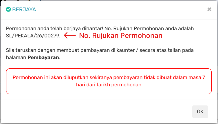 - Pop-up mesej “Permohonan Anda Telah Berjaya Dihantar! No. Rujukan Permohonan anda adalah XX/PEKALA/XX/XXXXX” akan terpapar.