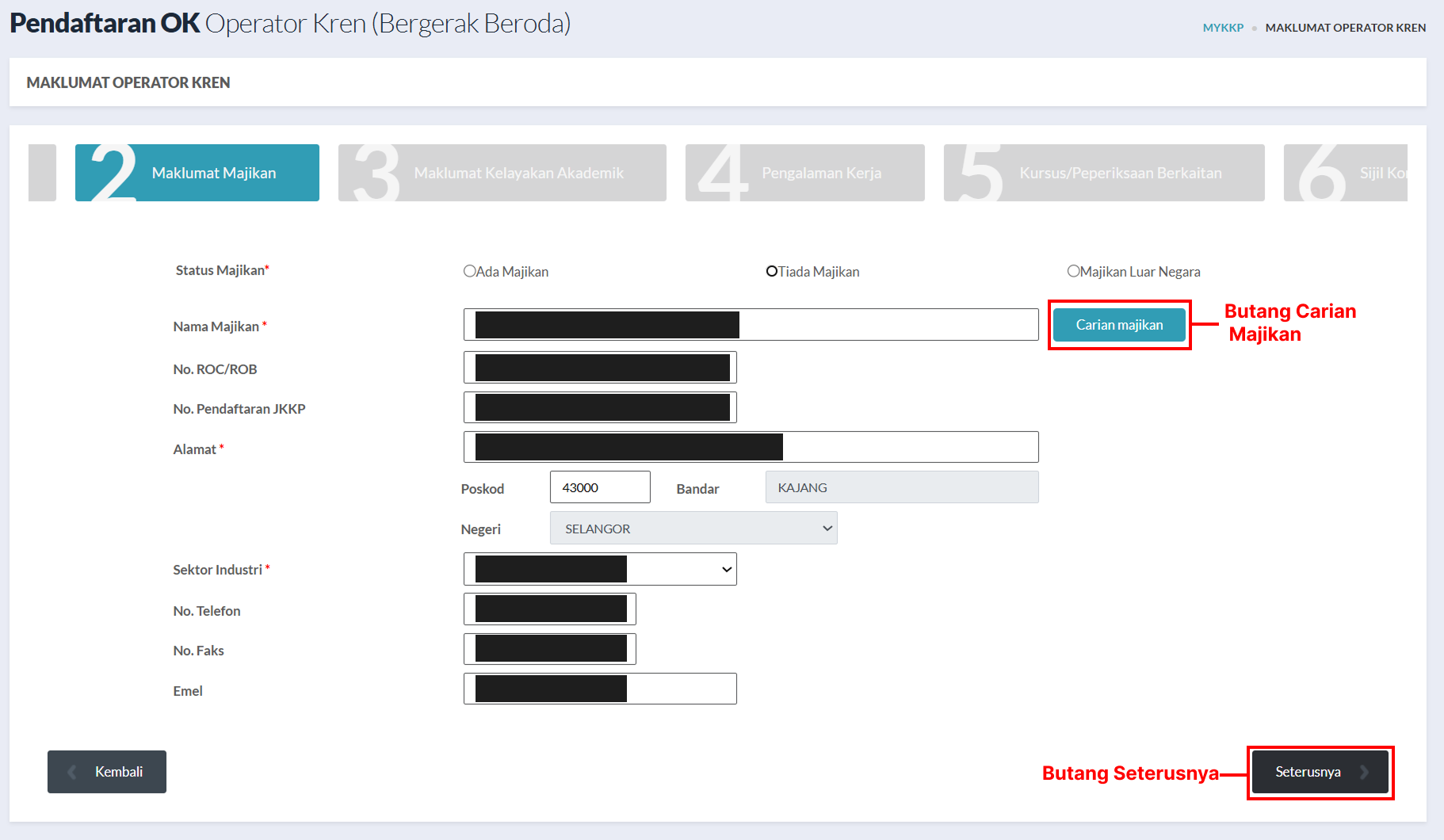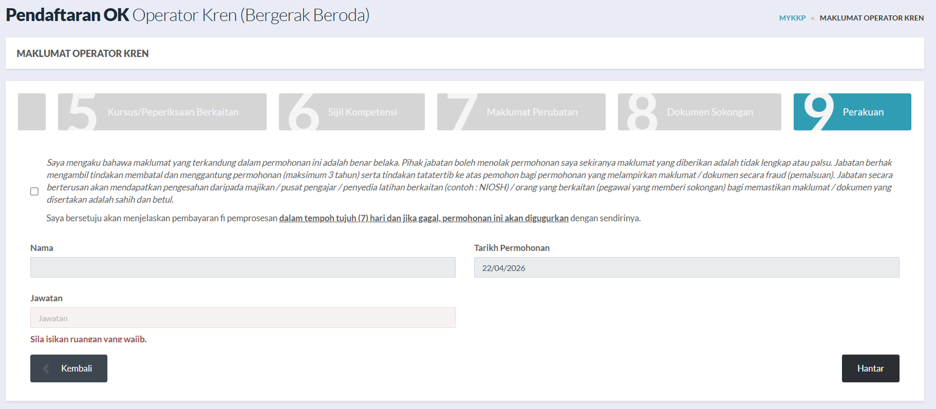 Langkah 3: Pengisian Borang Pendaftaran Operator Kren Menara