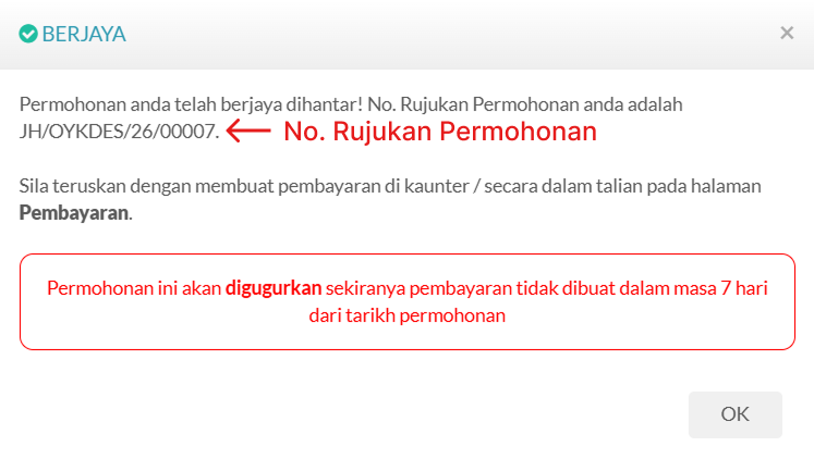 - Pop-up mesej “Permohonan Anda Telah Berjaya Dihantar! No. Rujukan Permohonan anda adalah XX/XX/XXX/XXXX” akan terpapar