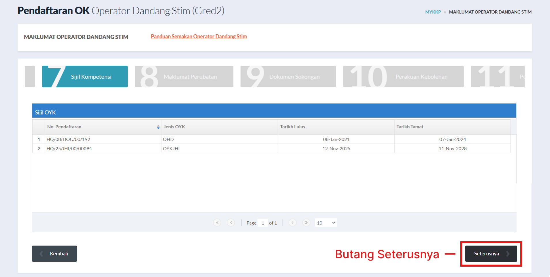 - Rekod Sijil Kompetensi akan terpapar sekiranya pemohon memiliki sijil kompetensi yang lain.